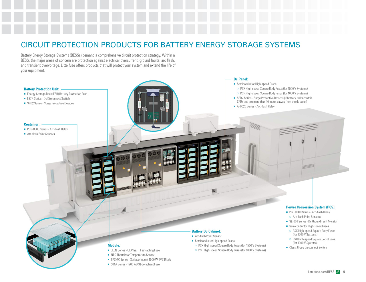 Battery Energy Storage Systems (BESSs) demand a comprehensive circuit protection strategy. Within a BESS, the major areas of concern are protection against electrical overcurrent, ground faults, arc flash, and transient overvoltage. Littelfuse offers products that will protect your system and extend the life of your equipment.